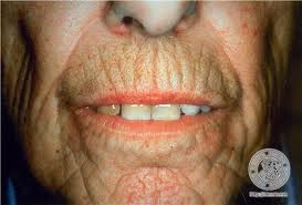 As manifestações cutâneas, nem sempre presentes, correspondem a uma tumefação da pele, que em alguns sectores pode adotar uma coloração vermelha ou violeta, enquanto que noutros tem tendência para descamar. Embora as lesões eruptivas, na maioria dos casos, apenas afetem o rosto, nomeadamente ao nível das pálpebras e à volta dos olhos, por vezes, também se manifestam no pescoço, no tronco, nos braços e nas pernas. Por vezes, a doença provoca uma típica erupção cutânea dos cotovelos, joelhos e tornozelos.